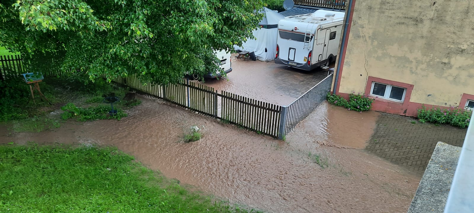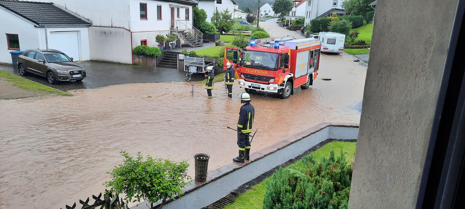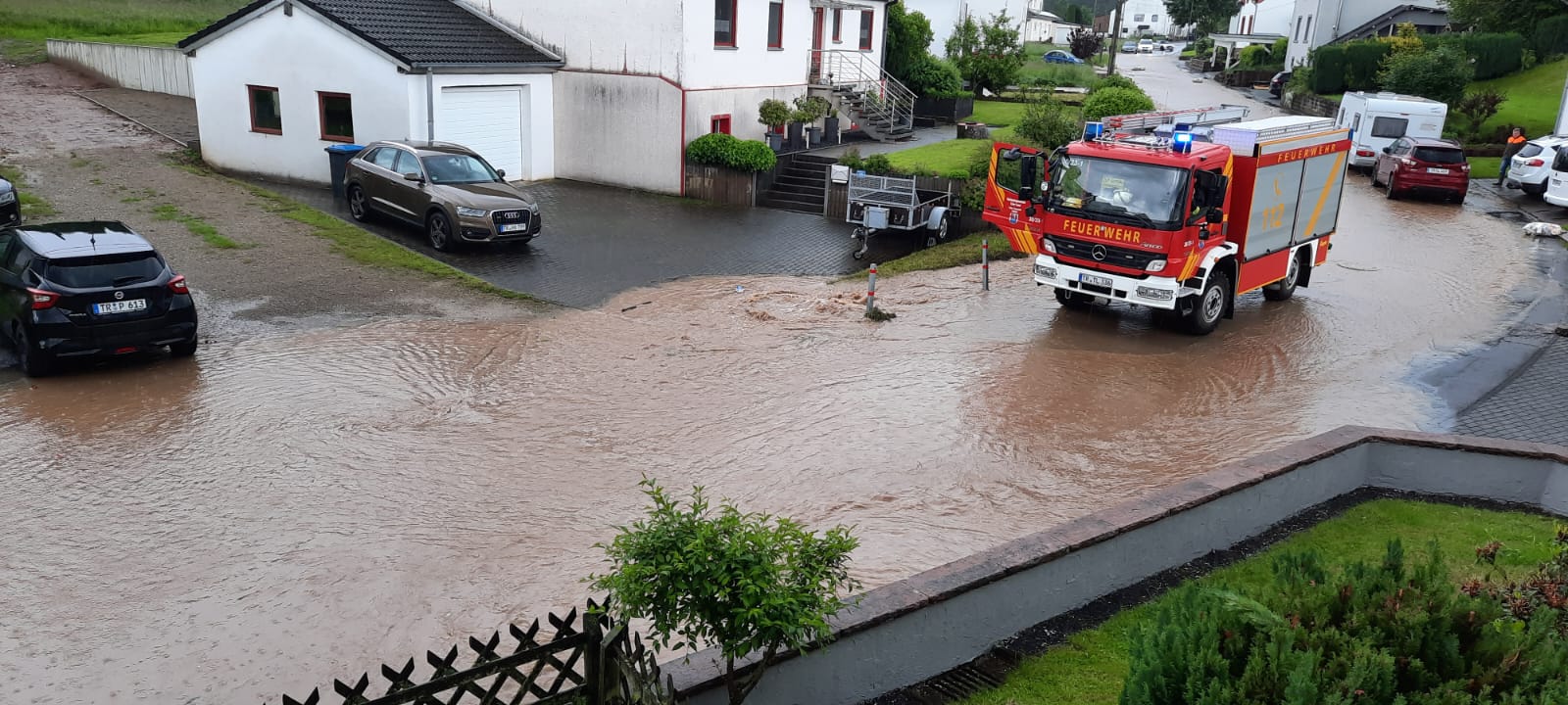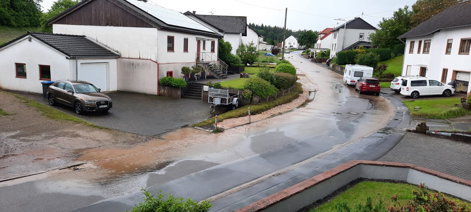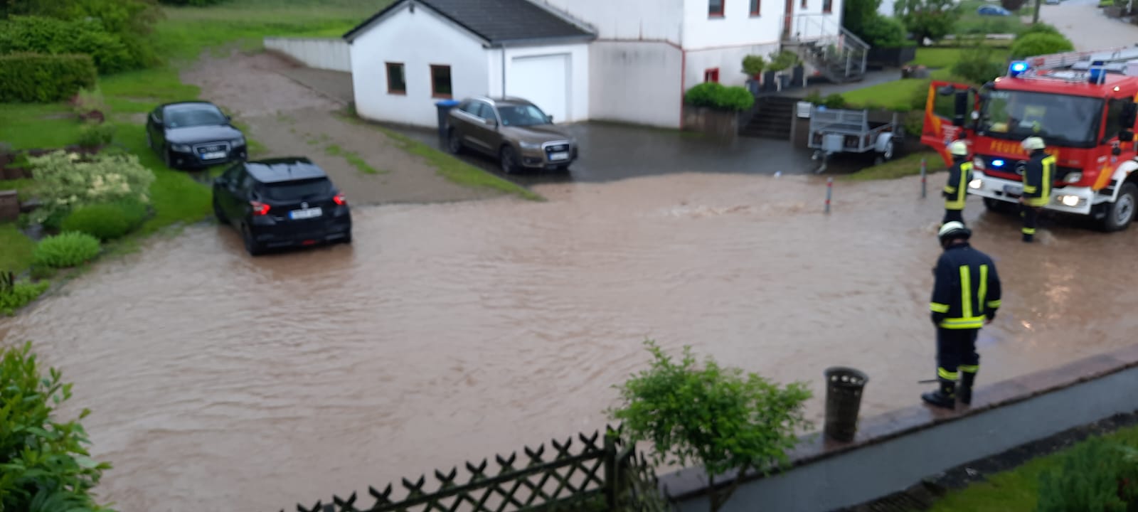 Durch Starkregen kam es erneut in der Ortslage Zemmer im Bereich der Mülchenstraße und der Gruhbachstraße innerhalb kürzester Zeit zu Überflutungen. Die Feuerwehr Zemmer reinigte die Einläufe von angeschwemmten Ästen und Unrat und forderte Sandsäcke an, die im vorderen Bereich einiger Wohnhäuser plaziert wurden, um bei einem weiteren Anstieg ein Eindringen des Wassers in die Gebäude zu verhindern.