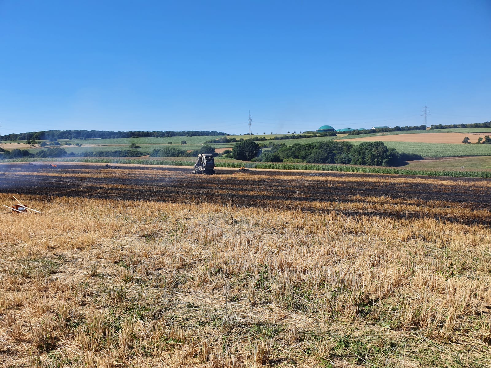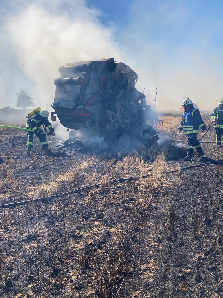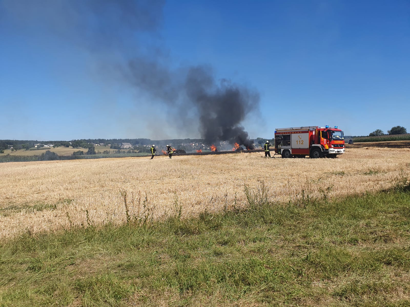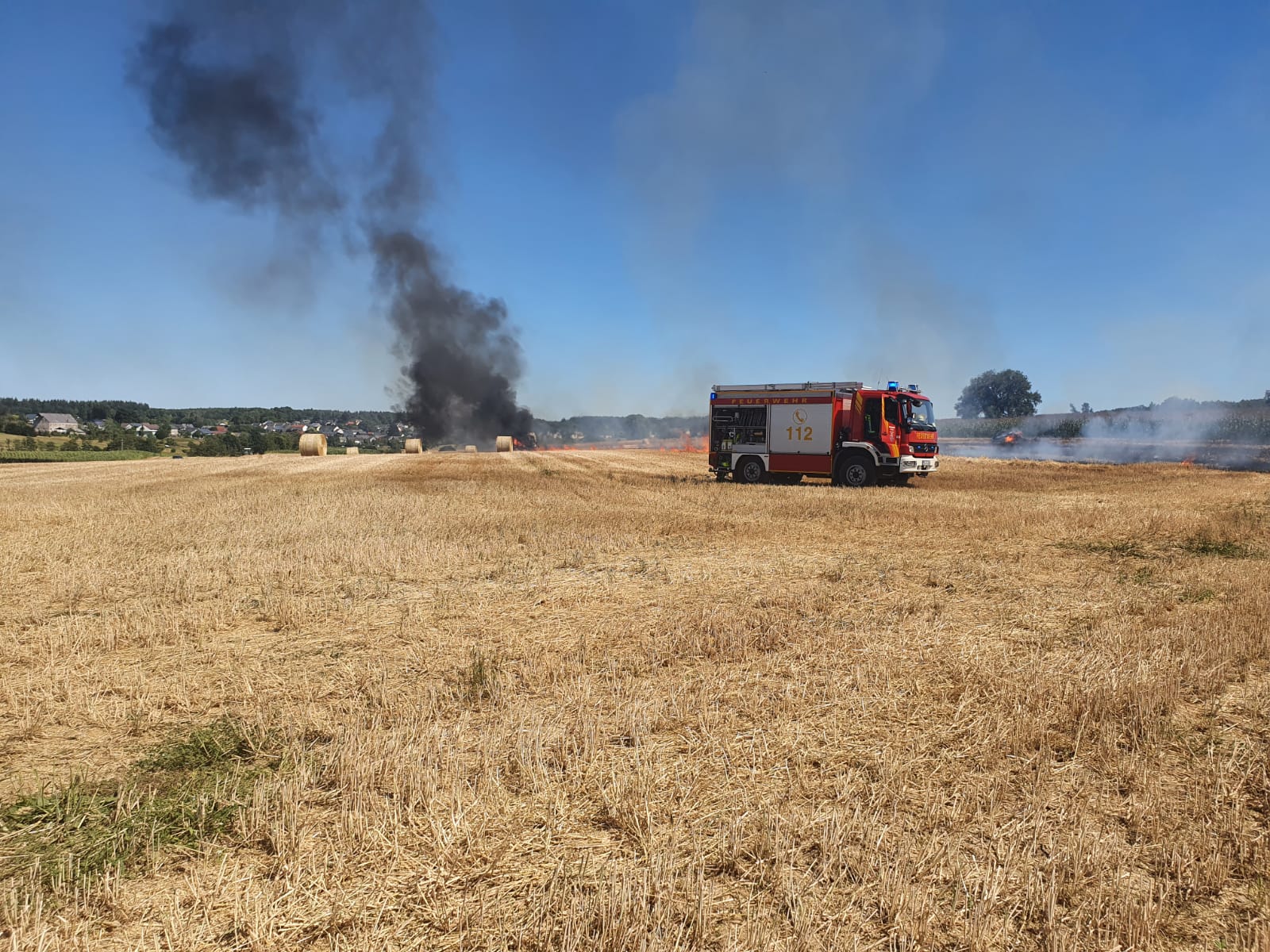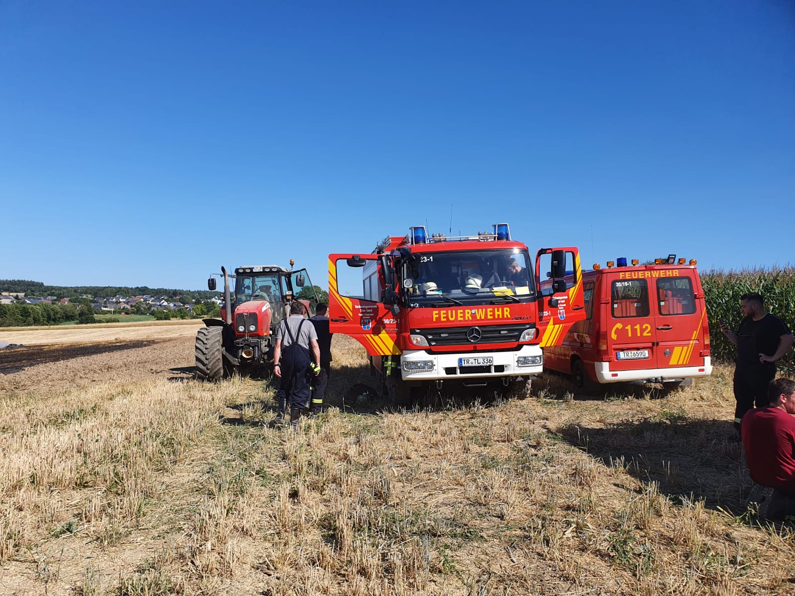 Auf einem Feld im Bereich der Kläranlage Zemmer geriet eine Strohpresse vmtl. aufgrund der hohen Außentemperaturen von über 40 Grad Celsius in der Sonne in Brand. Als der Fahrer die Flammen und die Rauchentwicklung bemerkte konnte er noch rechtzeitig die Maschine vom Traktor abhängen und diesen in Sicherheit bringen. Durch die extreme Trockenheit griff das Feuer jedoch rasch auf das Stoppelfeld über, so daß beim Eintreffen der Feuerwehr bereits ca. 7000 qm Feld, sowie mehrere Strohballen in Flammen standen. Die Feuerwehr konnte jedoch noch rechteitig ein Übergreifen der Flammen auf ein angrenzendes Getreidefeld verhindern. Die Strohpresse brannte völlig aus. Aufgrund der lang anhaltenden Trockenheit wurde bereits bei Eintreffen an der Einsatzstelle 2 weitere Tanklöschfahrzeuge von der FF Kordel und FF Speicher nachalarmiert.