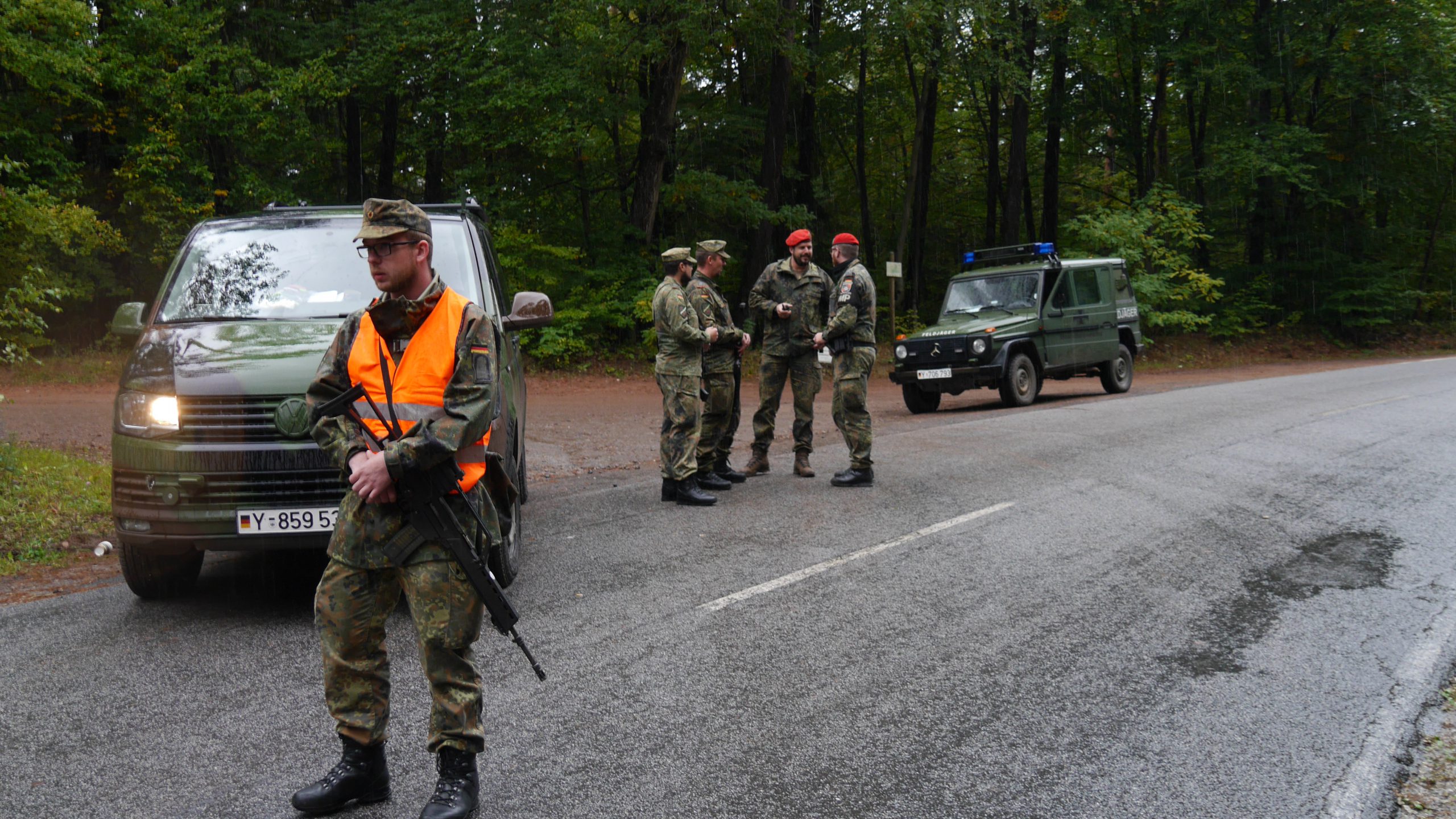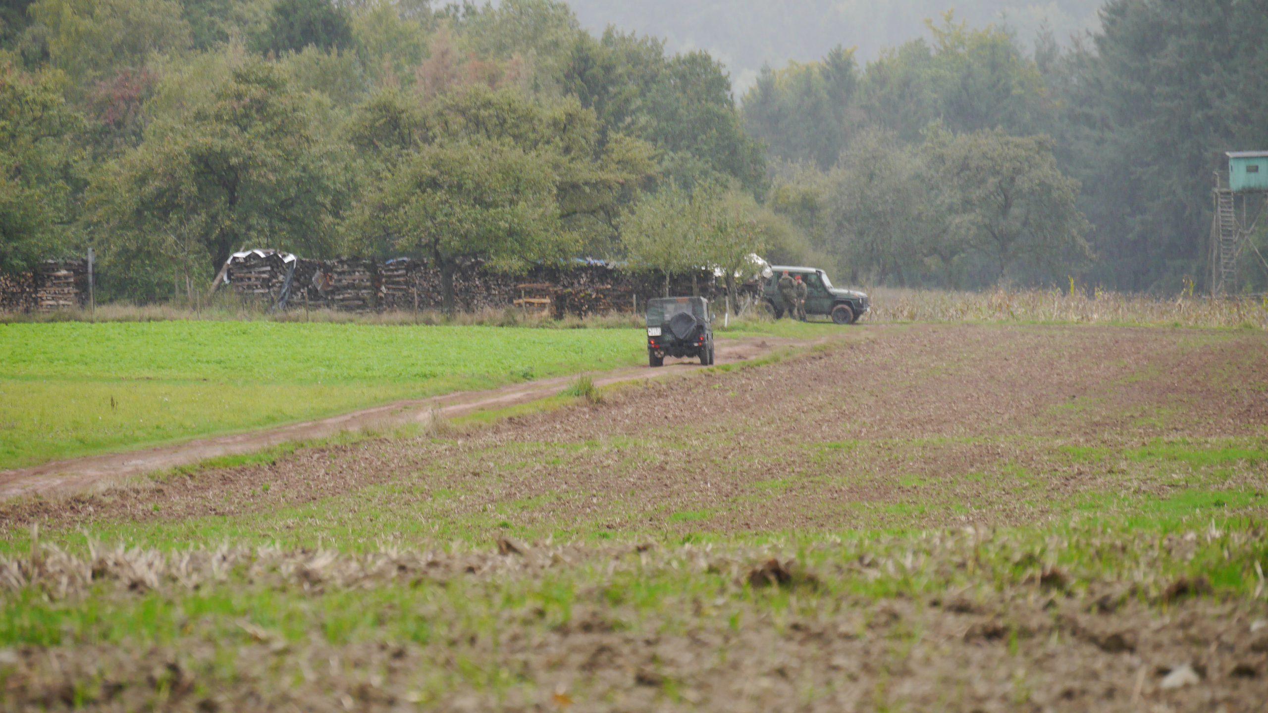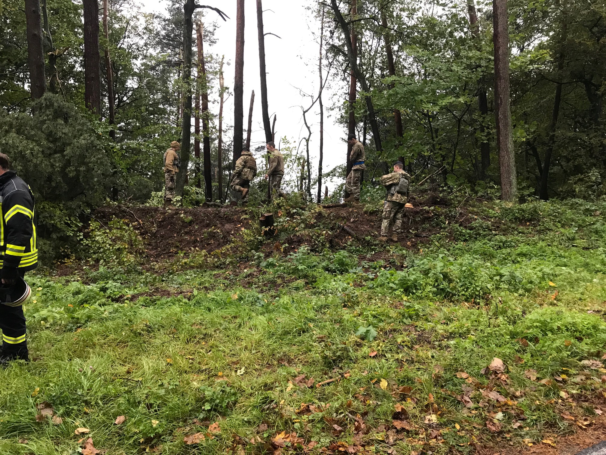 Solange ist die K 34 auch voll gesperrt. Von beiden Seiten der Sperrung stehen Soldaten der Bundeswehr uns sichern die Sperrungen zusätzlich ab. Auch sämtliche Landwirtschaftswege und Waldweg sind bewacht und gesperrt.