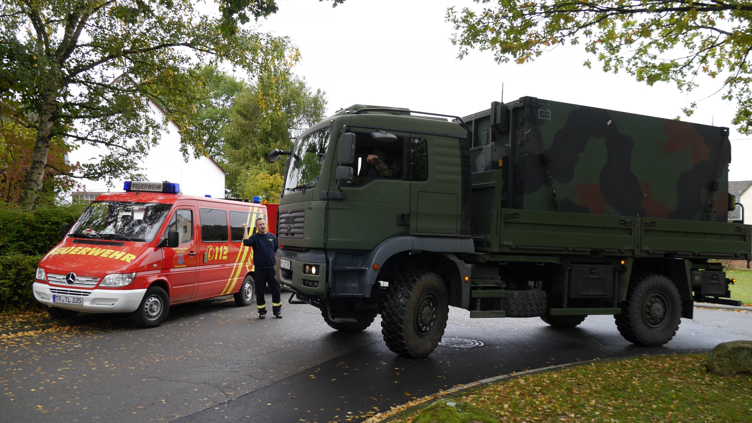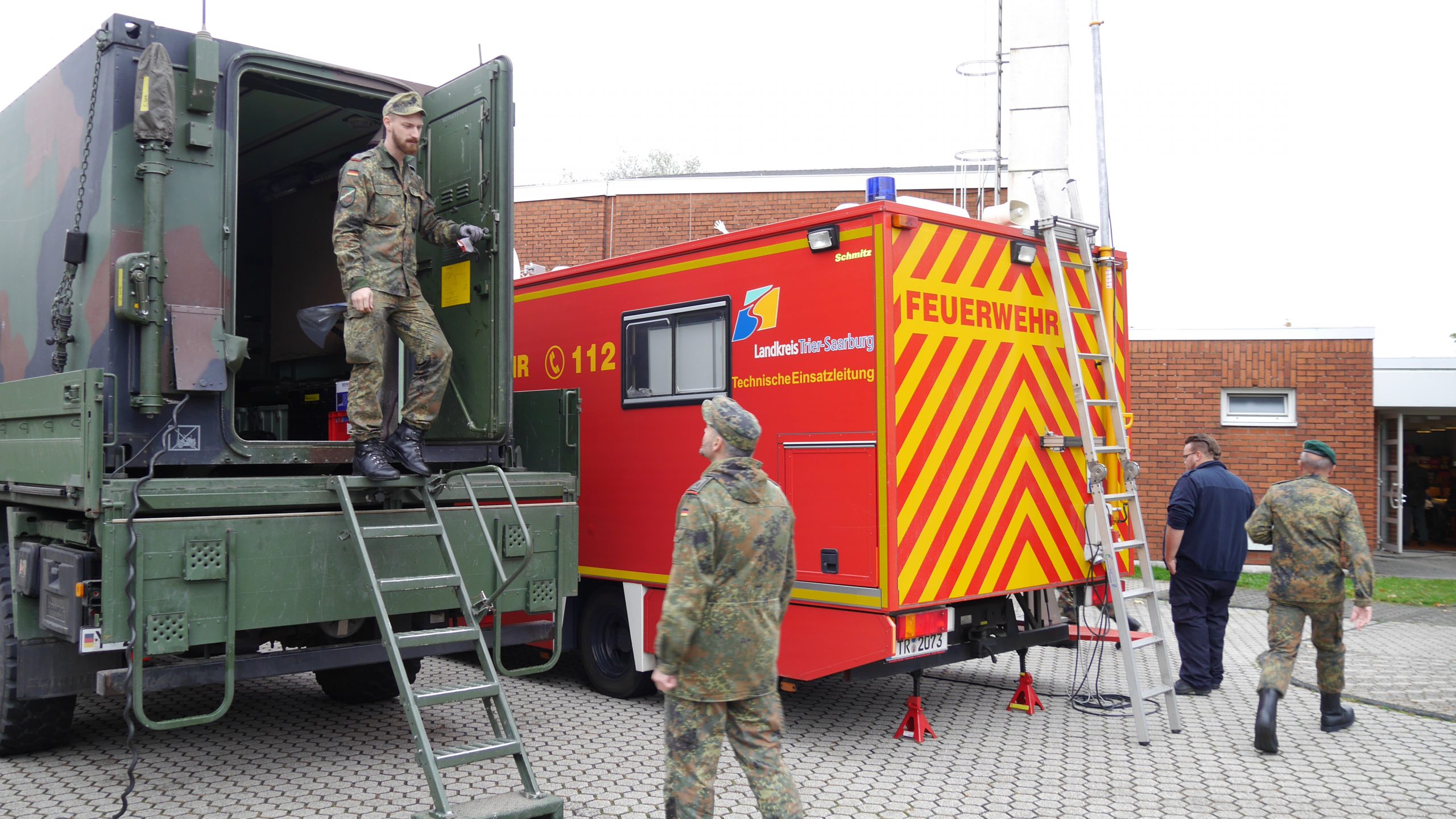 Am Tag danach haben sich die Verantwortlichen der US- Army, der Bundeswehr, der technischen Einsatzleitung und Führungskräfte der Feuerwehr Trier- Land an der Einsatzzentrale an der Halle getroffen. Schon früh hatte die US- Airbase die Verantwortung der Bundeswehr Rheinland- Pfalz übergeben. Etwa 100 Soldaten wurden unter anderem aus Idar- Oberstein nach Rodt verlegt, um dort ihren Einsatzbefehl auszuüben.