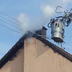 Zuvor wurden die Stromleitungen von der Drehleiter aus durch die Fa. Westnetz abgeklemmt und geerdet.