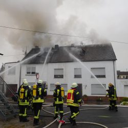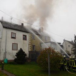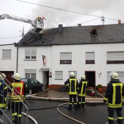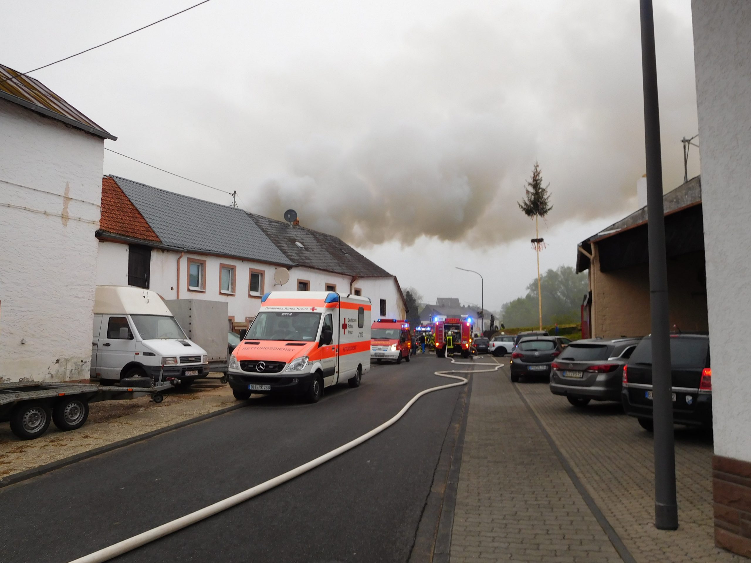 Als die örtliche Feuerwehr eintraf, schlugen bereits erste Flammen aus dem Dachstuhl. Unmittelbar wurden weitere Kräfte nachalarmiert, darunter auch die FF Zemmer.