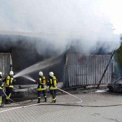 Beim Eintreffen der ersten Einsatzkräfte an der Einsatzstelle stand die Lagerhalle, die zu einem ortsansässigen Dachdeckereibetrieb gehört bereits in Vollbrand. Umgehend begannen zahlreiche Trupps unter schwerem Atemschutz mit den Löscharbeiten. Die Flammen griffen auch bereits auf ein Auto über, das vor der 15 mal 25 Meter großen Halle stand.