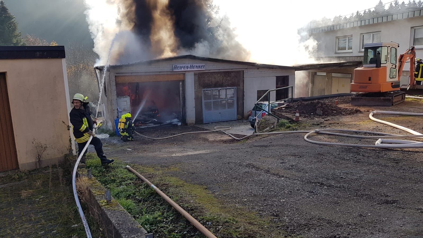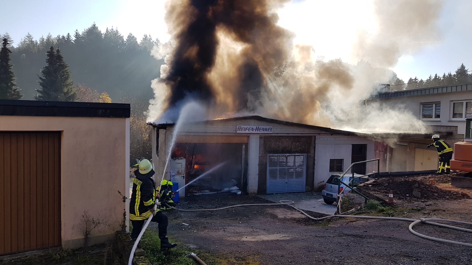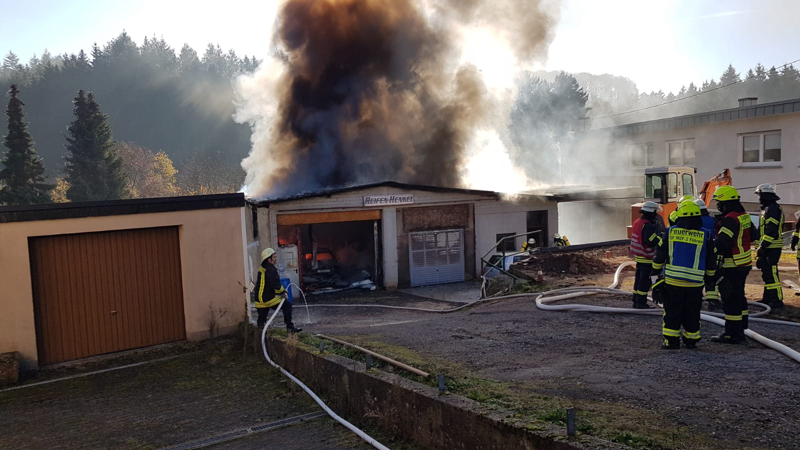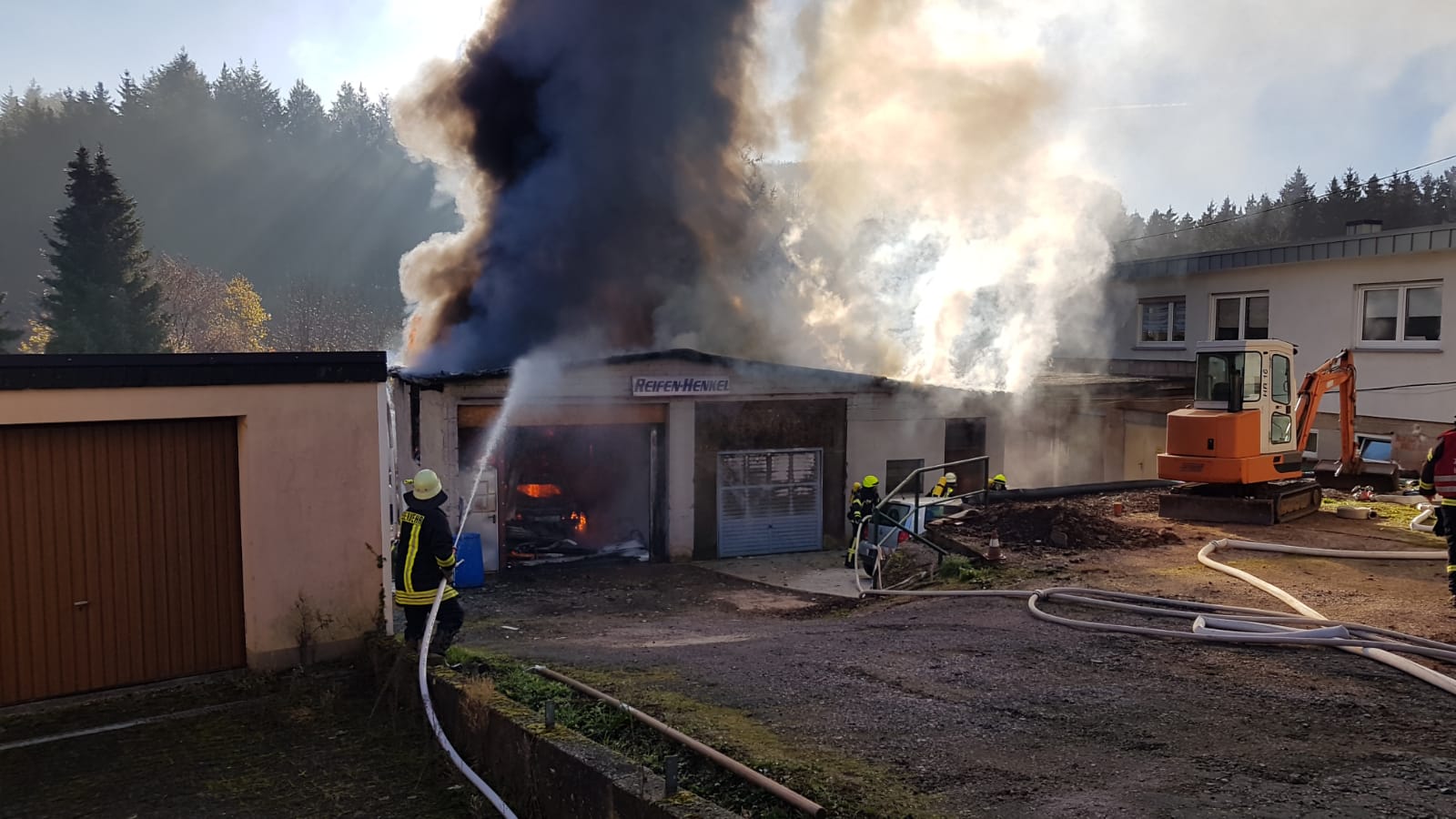 In einer Lagerhalle in Naurath / Eifel kam es am Samstagvormittag zu einem Vollbrand. Die Halle wurde als Reifenhandel und Werkstatt genutzt. Beim Eintreffen der ersten Feuerwehren stand die Halle, in der sich noch zwei Fahrzeuge befanden bereits in Vollbrand. Die Feuerwehren der umliegenden Gemeinden konnten ein Übergreifen der Flammen auf benachbarte Wohngebäude verhindern. Die Halle brannte vollständig aus und ist einsturzgefährdet. Es entstand ein Sachschaden von ca. 150000 €.