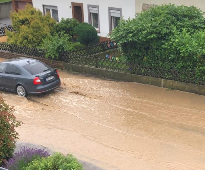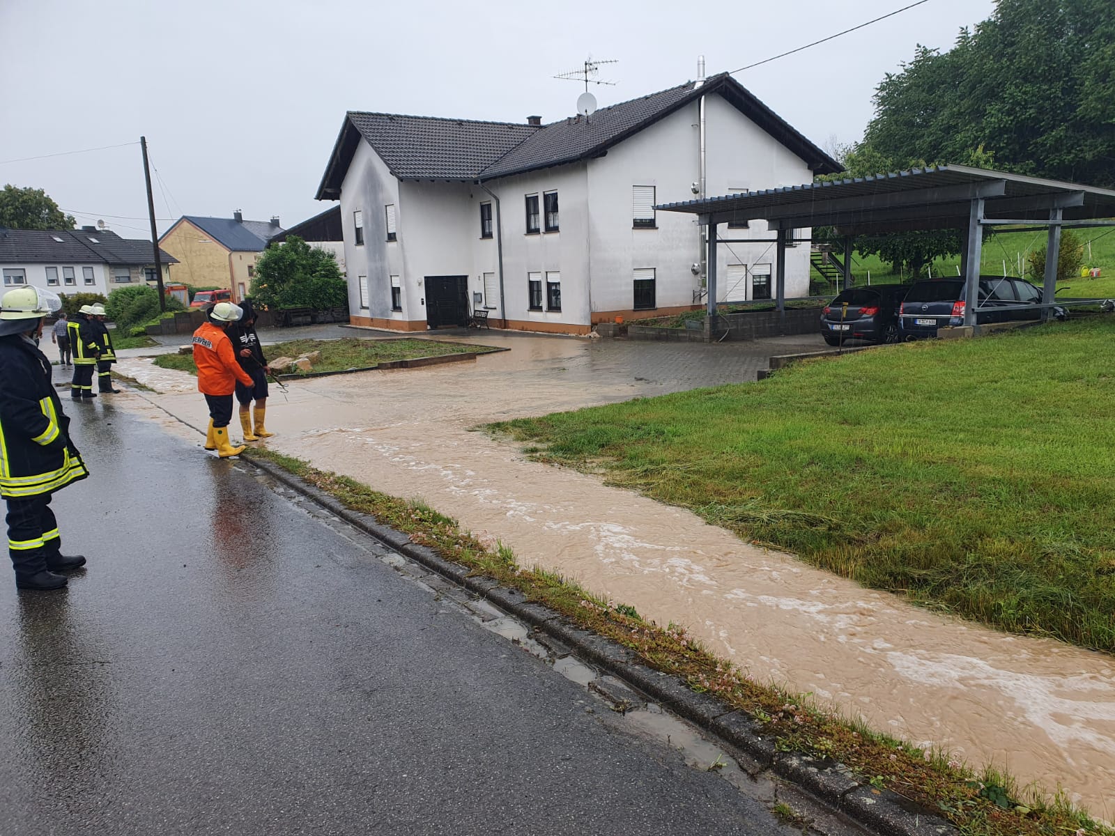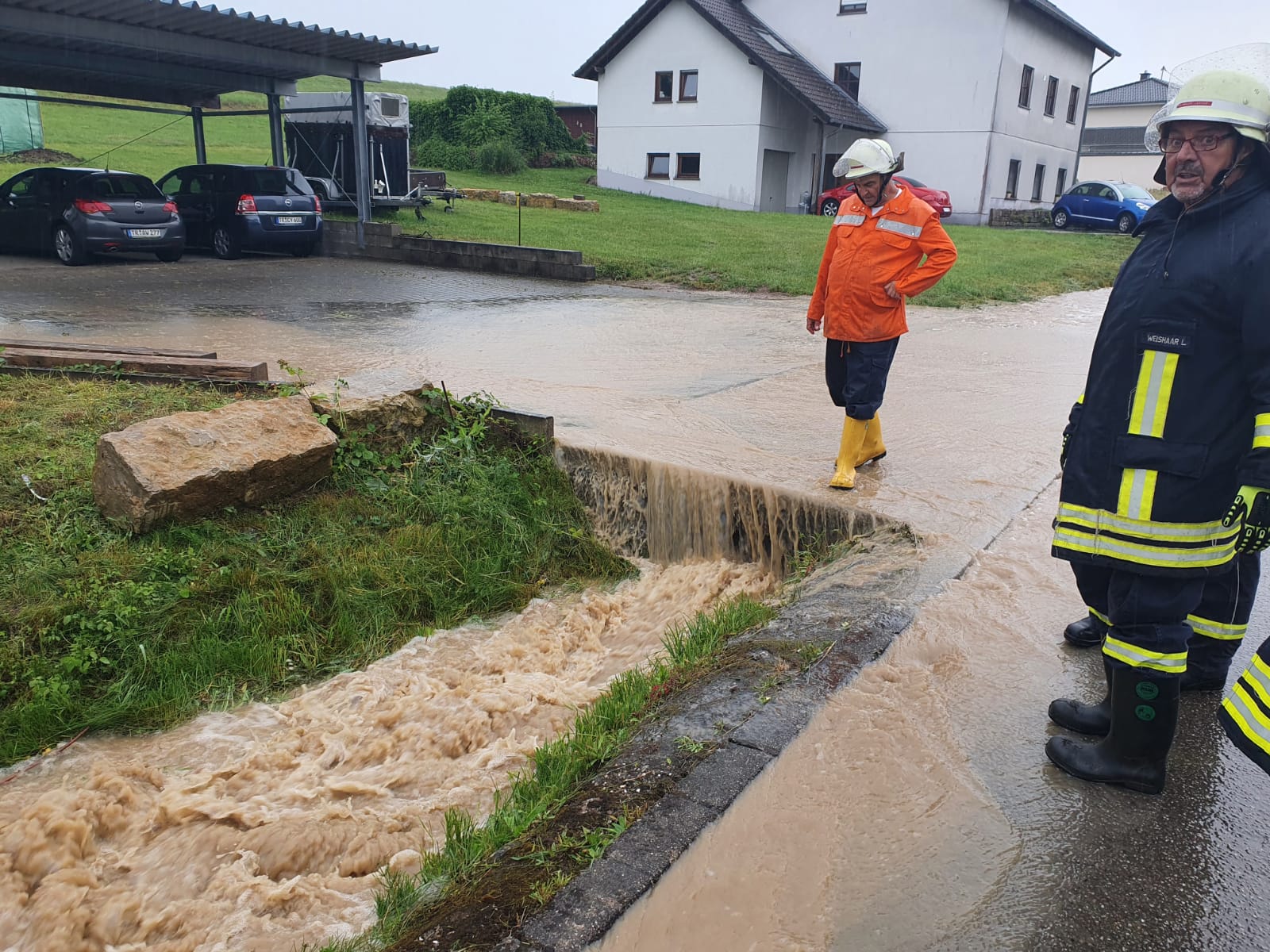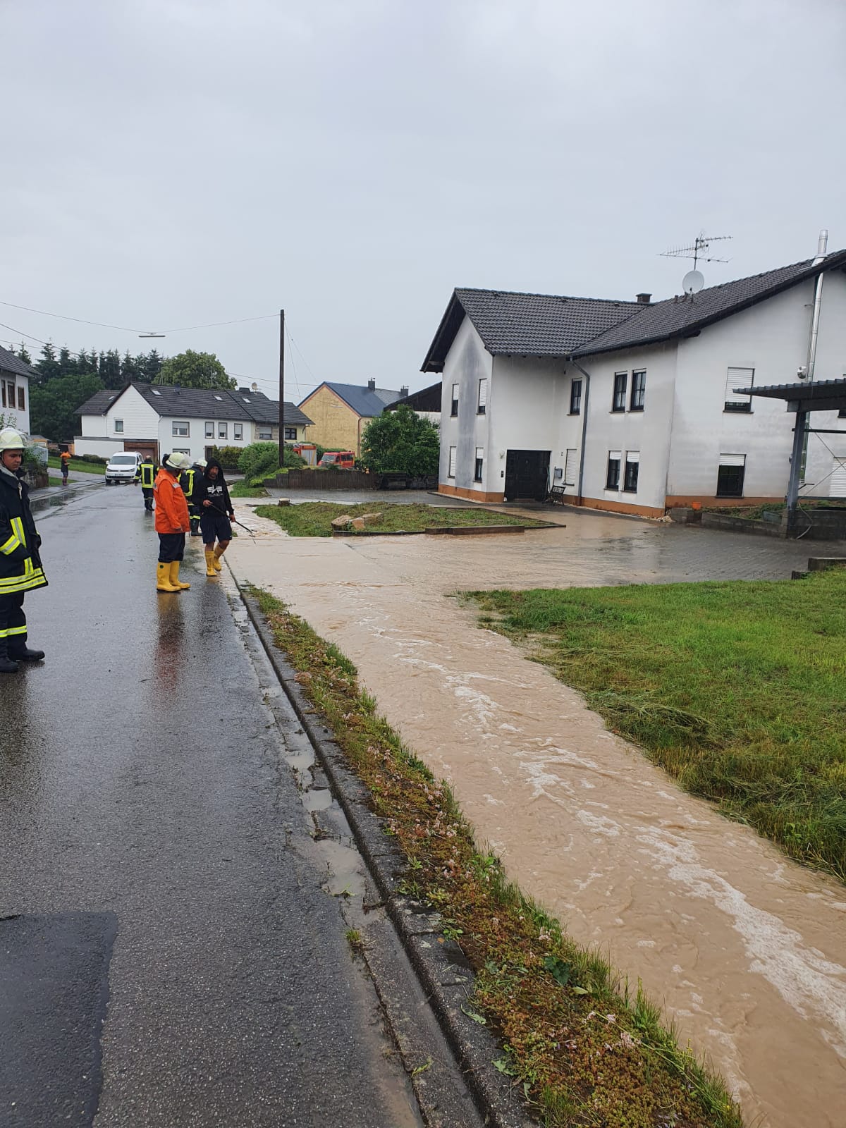In Folge eines Starkregenereignisses kam es in der Mülchenstrasse zu einer Überflutung. Der Bach schwoll in kürzester Zeit so stark an, das die Durchlässe die Wassermassen nicht mehr fassen konnten. Zudem war der Einlauf durch Unrat teilweise verstopft. Dank den Anwohnern, die rechtzeitig die Feuerwehr alarmierten und eigenständig bereits den Einlass freiräumten konnte eine größere Überflutung in der Ortslage verhindert werden. Dies ist auch dem schnellen Eingreifen des Bauhofes zu verdanken, der ebenfall in der Ortslage im Einsatz war.