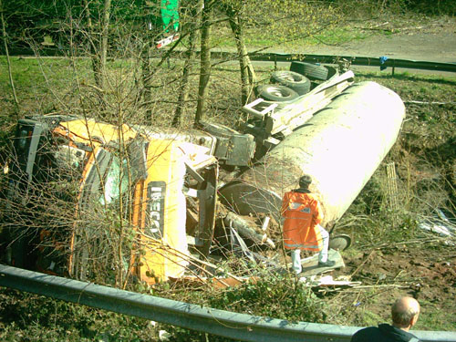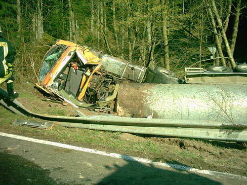 Ein mit 27.000 ltr. Klärschlamm beladener Sattelauflieger kam auf der K34 aus bislang ungeklärter Ursache von der Fahrbahn ab, durchbrach die Leitplanken, stürzte eine angrenzende Böschung hinunter, überschlug sich und blieb auf der Seite liegen. Glücklicherweise blieb der Fahrer unverletzt.