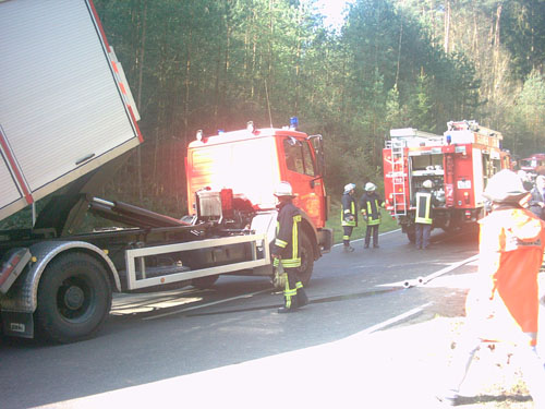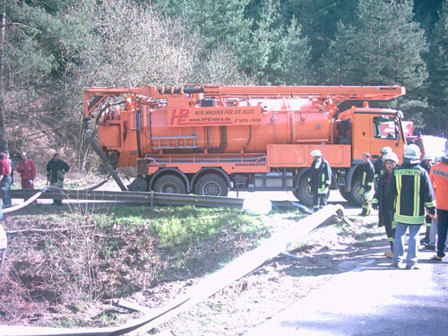 Ca. 4000 ltr. Klärschlamm und geringe Mengen Hydrauliköl traten aus dem Havaristen aus. Die eingesetzten Feuerwehren (Berufsfeuerwehr Trier, Löschzug Ehrang, FF Rodt und Zemmer) übernahmen den Brandschutz, brachten Ölschlängel in den Bachlauf ein, sicherten die Einsatzstelle und unterstützten bei der Bergung des verunfallten Fahrzeuges.