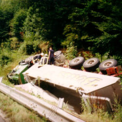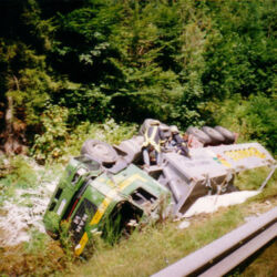 Ein mit 25 Tonnen beladener LKW befuhr die L46 in Richtung Zemmer. In einer langgezogenen Linkskurve kam dieser von der Fahrbahn ab, durchbrach die Leitplanken und stürzte eine angrenzende Böschung hinab. Dabei überschlug sich das Fahrzeug und die Ladung kippte in einen Bach. Der Fahrer wurde schwer verletzt, war aber nicht in seinem Fahrzeug eingeklemmt.