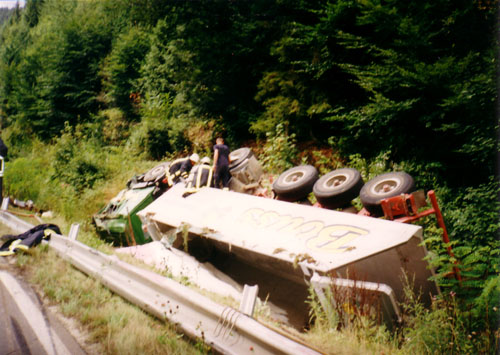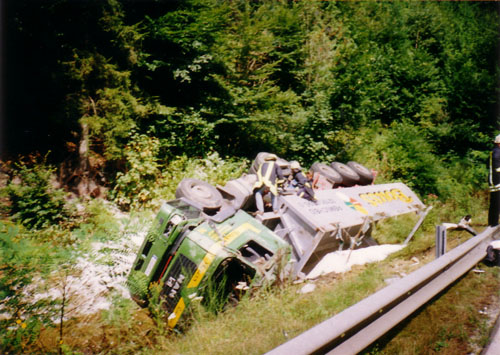 Ein mit 25 Tonnen beladener LKW befuhr die L46 in Richtung Zemmer. In einer langgezogenen Linkskurve kam dieser von der Fahrbahn ab, durchbrach die Leitplanken und stürzte eine angrenzende Böschung hinab. Dabei überschlug sich das Fahrzeug und die Ladung kippte in einen Bach. Der Fahrer wurde schwer verletzt, war aber nicht in seinem Fahrzeug eingeklemmt.