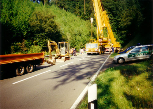 Die Bergung des Sattelzuges erfolgte durch ein Trierer Spezialunternehmen mittels 2 großen Kränen.