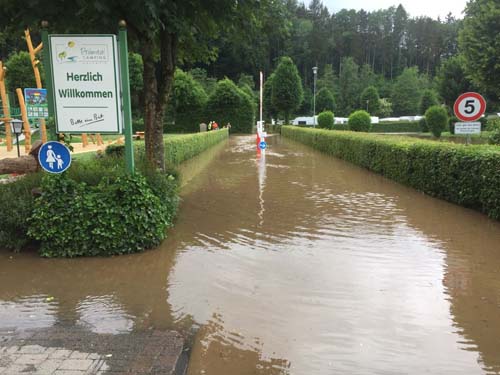 Das schwere Gewitter der vergangenenen Nacht hatte auch im Eifelkreis Bitburg-Prüm seine Spuren hinterlassen. Dort herschten teilweise katastrophale Zustände. In zahlreichen Ortschaften der VG Südeifel, sowie im Bitburger-Land ergossen sich Wassermassen und Schlammlawinen durch die Ortschaften. Bei Bitburg-Erdorf entgleiste ein Zug kurz hinter einem Tunnel durch eine Schlammlawine. Auch ein Fahrzeug wurde mit in die Tiefe gerissen. Im Lünebacher Zoo wurden die Gehege so stark beschädigt, das ein Bär ausbrach, der daraufhin erschossen werden musste. Mehrere Raubkatzen konnten glücklicherweise später durch Einsatzkräfte der Polizei und Feuerwehr wohlbehalten aufgefunden werden. Aufgrund der starken Niederschläge der vergangenen Nacht drohte der Biersdorfer Stausee überzulaufen und zu brechen. Daraufhin musste Wasser abgelassen werden, so das es zu einem starken Anstieg der Prüm kam mit den entsprechenden Überflutungen. Alleine der Pegel Prümzurlay stieg innerhalb weniger Stunden von knapp 60cm auf fast 5m an.