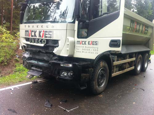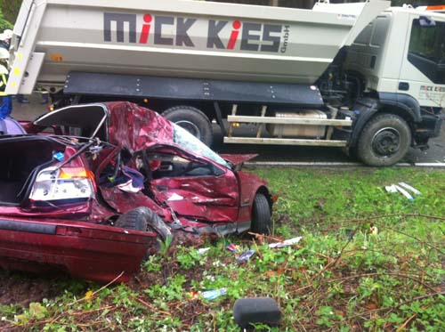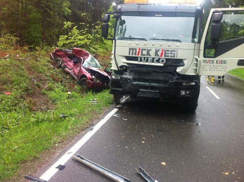 Ein 32jähriger US-Bürger kam vermutlich aufgrund nicht angepasster Geschwindigkeit kurz vor dem Blankenheimer Kreuz in Fahrtrichtung Zemmer nach rechts von der Fahrbahn ab, geriet dadurch ins Schleudern und kollidierte mit der Beifahrerseite auf der Gegenspur mit einem LKW. Während der PKW-Fahrer in seinem Wrack eingeklemmt wurde und vermutlich sofort tot war, blieb der 25jährige LKW Fahrer unverletzt. Er erlitt jedoch einen Schock und wurde medizinisch betreut.