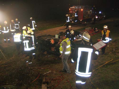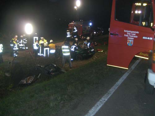 Ein mit 5 jungen Männern besetztes Auto ist in der Nacht zum Samstag auf der L46 bei Zemmer wegen überhöhter Geschwindigkeit von der Fahrbahn abgekommen. Das Fahrzeug drehte sich auf der Fahrbahn und prallte während es sich überschlug gegen einen in einer Böschung stehenden Baum. Durch die Wucht des Aufpralls wurde dieser entwurzelt. Ein in der Mitte hinten sitzender 19jähriger wurde dabei sofort tödlich verletzt. Die neben ihm sitzenden Jugendlichen wurden schwerst verletzt und waren eingeklemmt. Der ebenfalls 19jährige Beifahrer wurde auch schwerst verletzt und war im Wrack eingeklemmt. Dieser starb später aufgrund seiner schweren Verletzungen auf dem Weg ins Krankenhaus. Der Fahrer konnte sich selbst verletzt aus dem Wrack befreien und wurde von der Feuerwehr versorgt bis der Rettungsdienst eintraff.