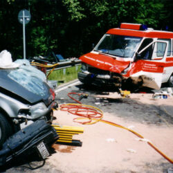 Ein Krankenwagen kam in einer Rechtskurve auf die Gegenfahrbahn und stieß dort mit einem entgegenkommenden PKW frontal zusammen. Die PKW-Fahrerin war eingeklemmt und schwer verletzt. Ihr 8jähriges Kind leicht verletzt. Der 66jährige Patient im Krankenwagen wurde ebenfalls schwer – der Fahrer des Rettungswagens leicht verletzt. Die FF Zemmer befreite die Fahrerin des PKW`s und sicherte die Einsatzstelle. Zudem wurden auslaufende Betriebsstoffe aus beiden Fahrezugen abgestreut. Der Verkehr wurde weiträumig umgeleitet.