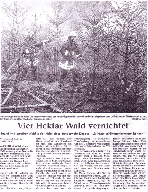 Ein Waldbrand in der Nähe eines Bundeswehrdepots zerstörte rund 4 Hektar Waldfläche. Es waren 9 Feuerwehren, sowie die Technische Einsatzleitung des Landkreises im Einsatz. Zur Wasserförderung wurden mehrere Tanklöschfahrzeuge eingesetzt und über 2000 Meter Schlauchleitungen verlegt. Der Großbrand war nach etwa 2 Stunden unter Kontrolle.